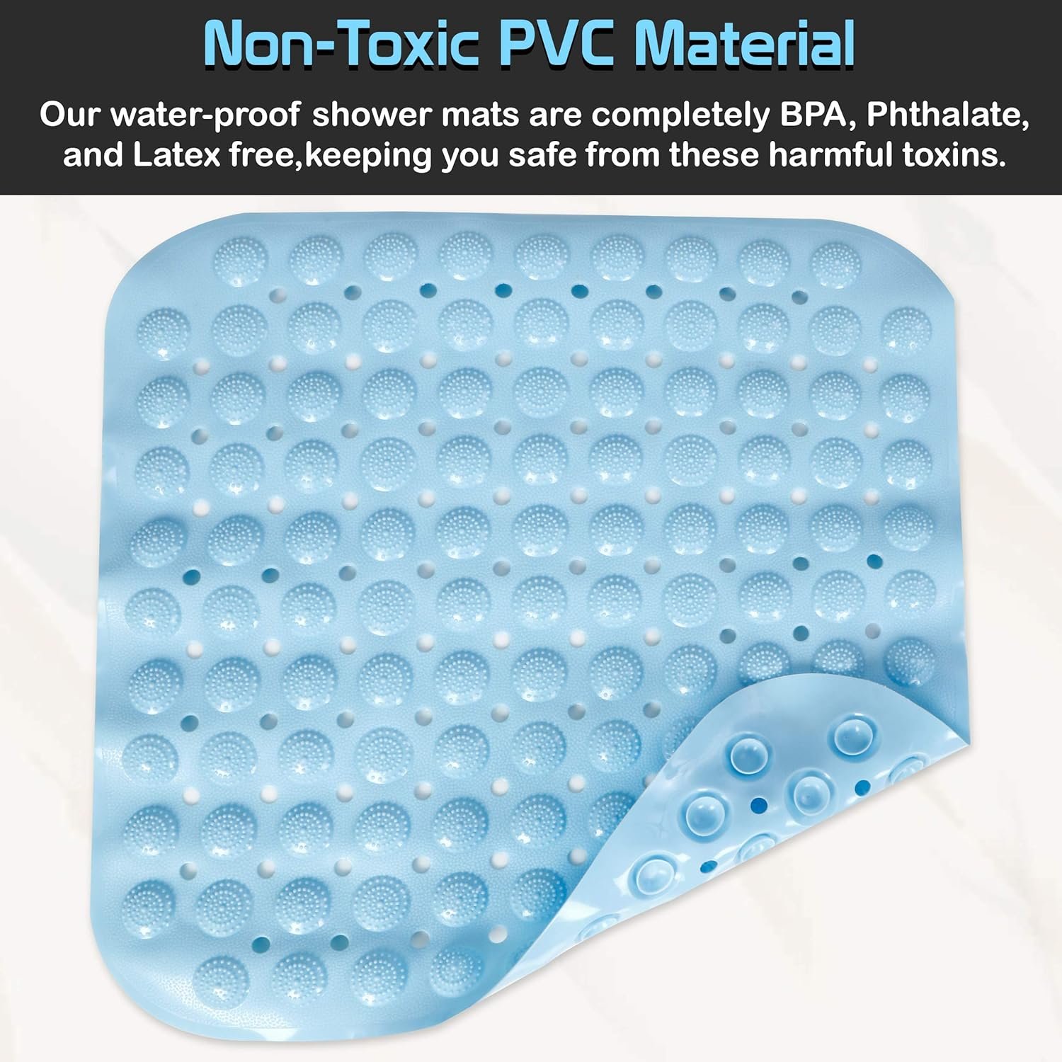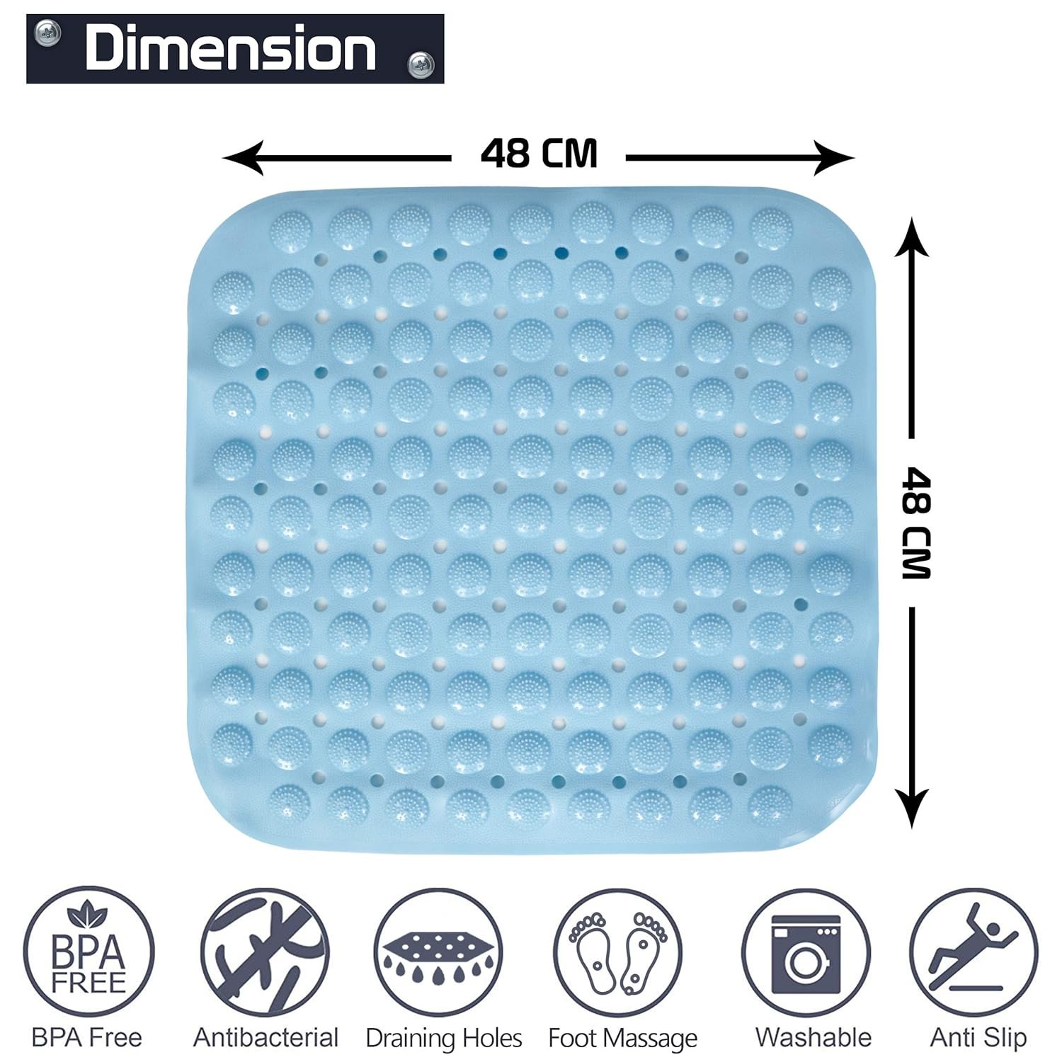 - PACK of 2 SHOWER MAT – Bathroom floor shower mat measures 48 cm x 48 cm. Package Content 2 PVC Non-Slip Mat for Bathroom Floor. With anti-skid shower mats for home -No more slipping accidents, no more fear of taking a hit to the head while you are enjoying a calm, relaxing bath. Get this non-slip bathtub mat which is made from Eco-friendly Anti-bacterial PVC Material providing a cozy yet slip-resistant surface for you to safely & comfortably get in and out of the shower.