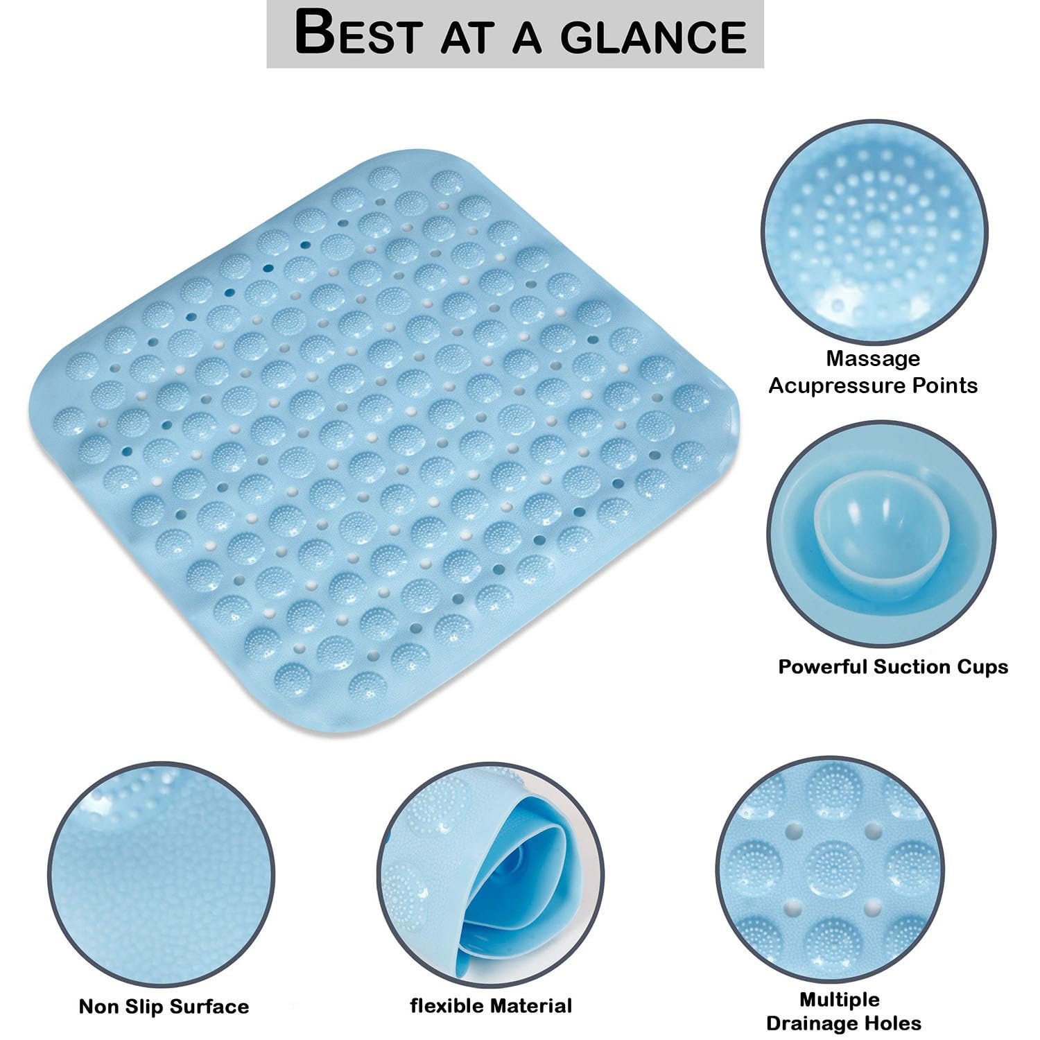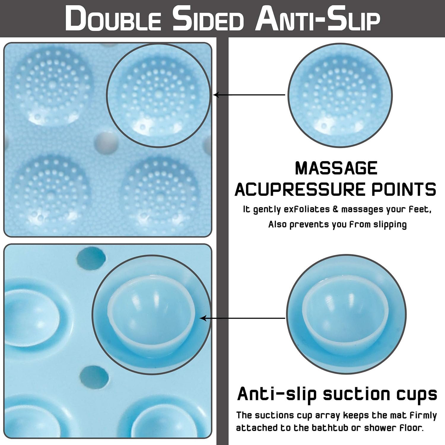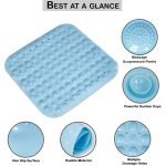 - ACUPRESSURE & FOOT SCRUBBER MASSAGE BATHING MAT – Give your feet a treat in the shower or bath with scrubbing & massage. Our nonslip shower mat features circular foot scrubbers to wash & cleanse while massaging feet. This antiskid bathroom mat help to exfoliate your feet & keep them clean and also provide a safe way for you to keep your footing in the shower.