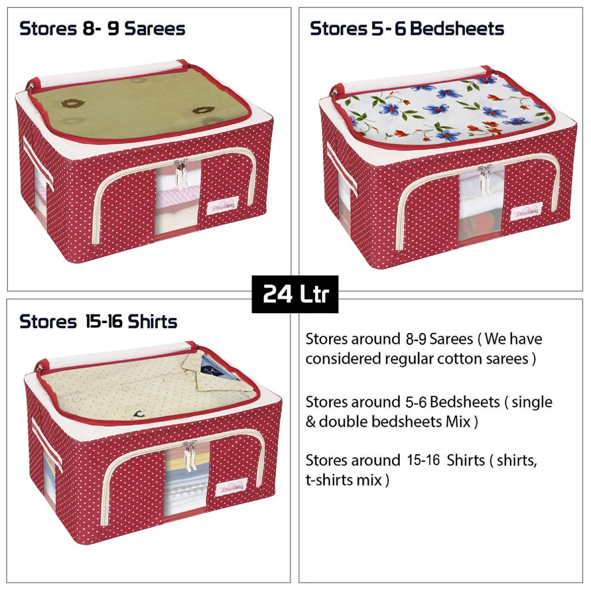 - COMPLETE PROTECTION – These Saree Boxes are made up of premium 600D oxford fabric with moisture proof lamination inside which protects valuable clothes from dust, moisture, fungus and moths. This wardrobe organizer for clothes is quite a sturdy storage box for your clothes; and eco-friendly too.