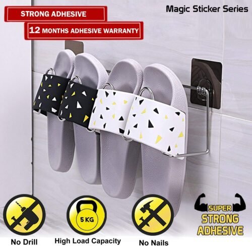 Keep your bathroom and bedroom organized with this Magic Sticker Series Self Adhesive Shoe Stand. Designed for flip flops, bathroom slippers, and bedroom slippers, this stainless steel wall-mounted holder is both functional and stylish.