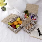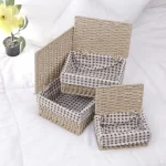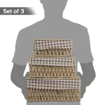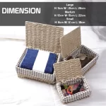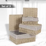 • Package contains pack of 3 handwoven paper weave baskets with lid. Dimensions: Large: 11x21x26 cm, Medium: 10x15x22 cm, Small: 8x12x18 cm.