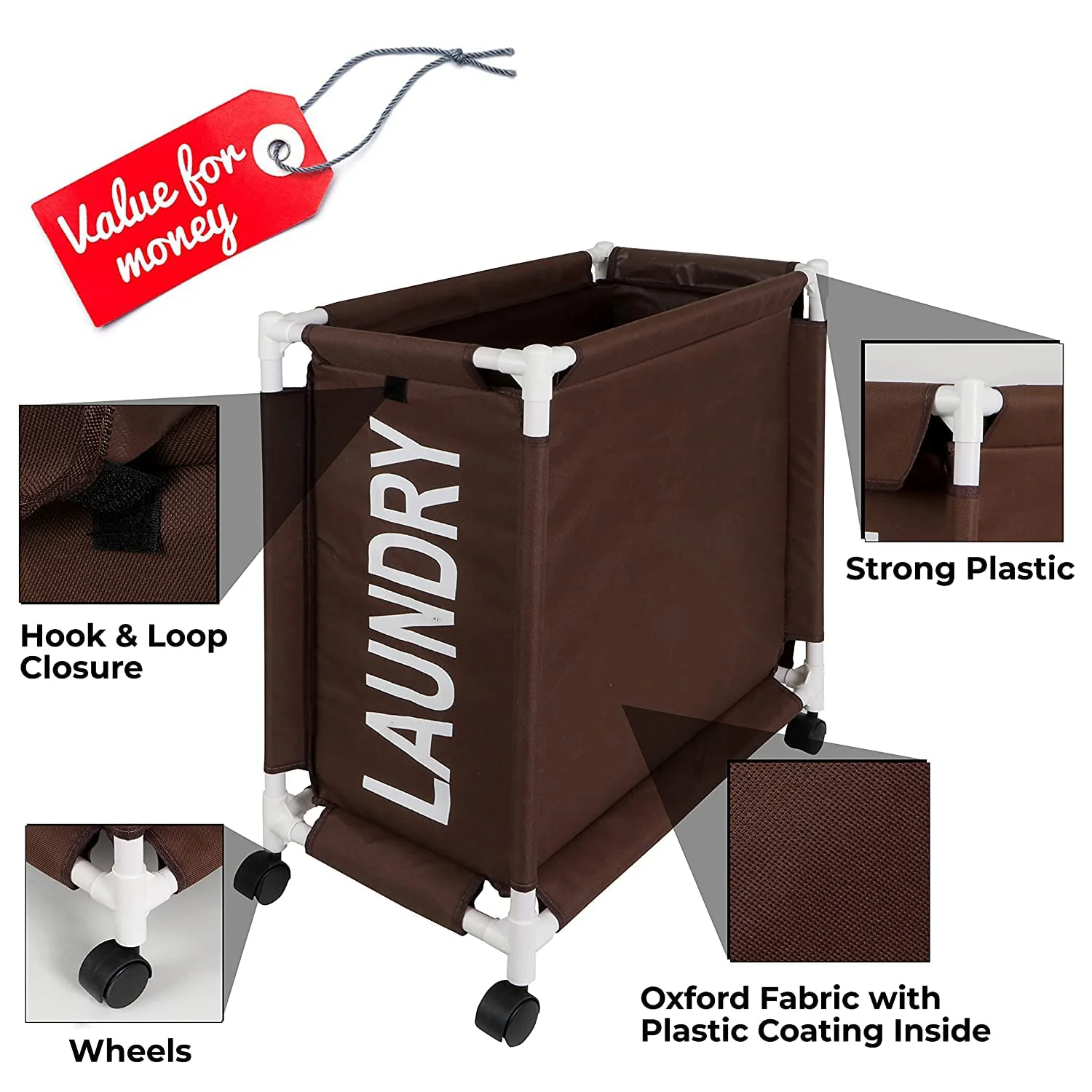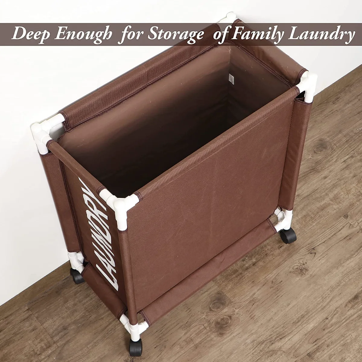 - LAUNDRY TROLLEY WITH WHEELS – Ensures easy movement, solving heavy lifting problem. Rolling wheels are sturdy to turn in all directions. PLASTIC COATING INSIDE -Inner surface of this laundry bag trolley is moisture resistant and perfect for dry or wet laundry.