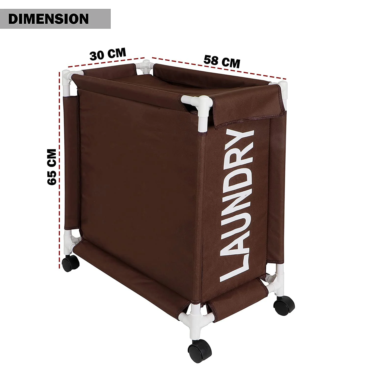 - SIZE – This laundry basket with wheels measures 58 cm in Length, 30 cm in Width and 65 cm in Height. PACKAGE CONTENT – 1 Rolling Laundry Hamper with Lid Cover.