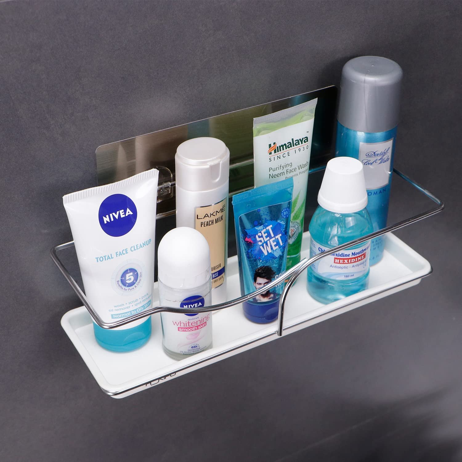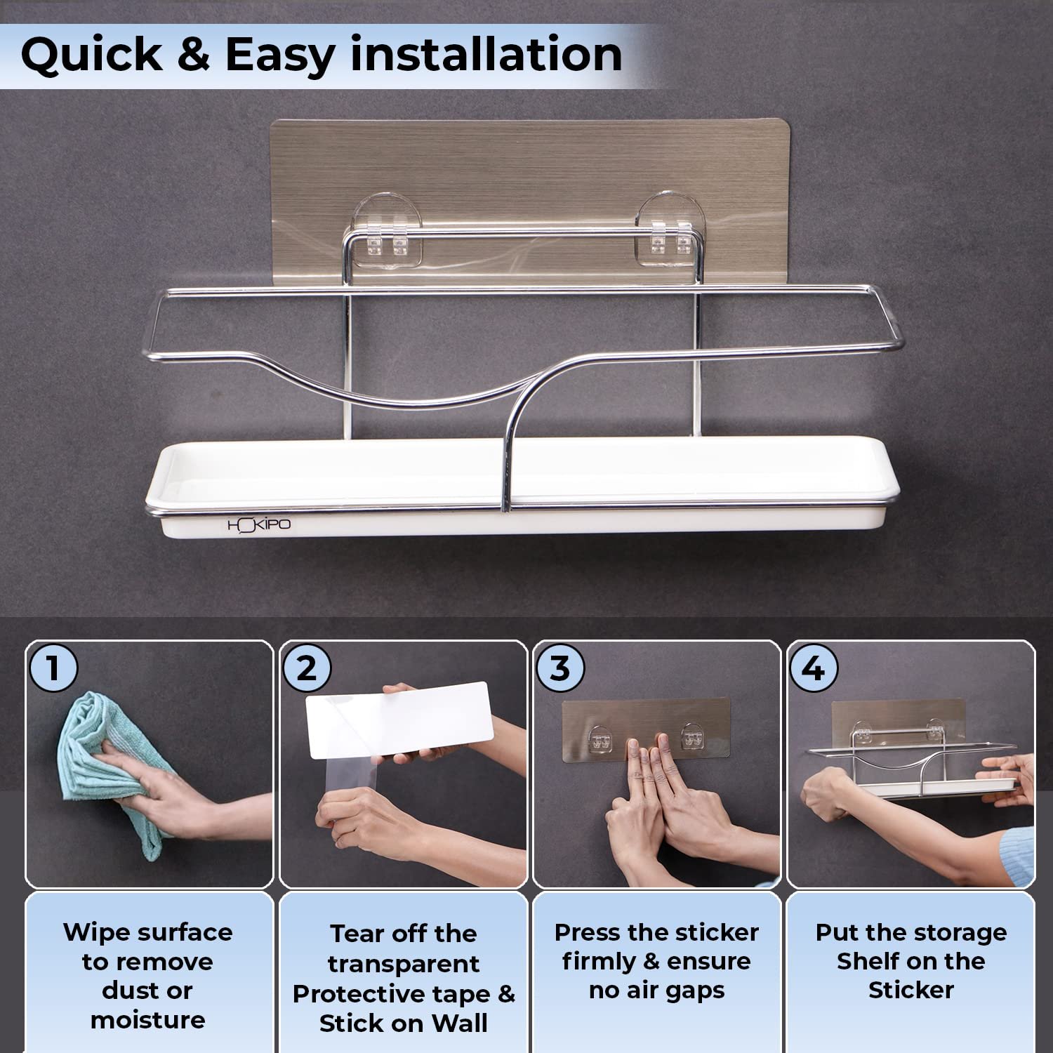 • HASSLE-FREE INSTALLATION – NO TOOLS . NO SCREWS. No More ugly holes in your bathroom or kitchen. Simply choose a smooth surface such as tiles, glass, metal. Apply Wall Mounted Bathroom Shelf and you’re done in No Time.