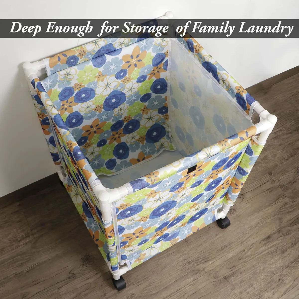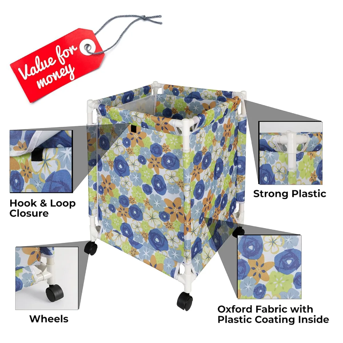 LAUNDRY TROLLEY WITH WHEELS – Ensures easy movement, solving heavy lifting problem. Rolling wheels are sturdy to turn in all directions. PLASTIC COATING INSIDE -Inner surface of this laundry bag trolley is moisture resistant and perfect for dry or wet laundry.